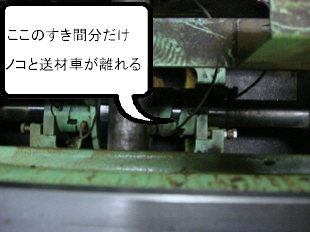 帯鋸です。これが回転して木を切ります。写真左、回転しているところ 写真右、停止しているところ。 この帯鋸は穴開きノコ と言って材にオガ粉が付着するのを防ぎす。