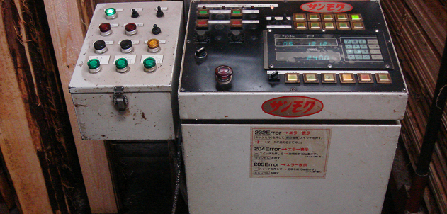 コンピューター式のデジタル歩出し機。ここに寸法を入力して、製材します。